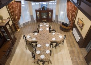 Летняя кухня со столом и стульями. Гардероб. Просторная гостиная на 40-45 персон. Огромная кухня с необходимой посудой и техникой с обеденной зоной.