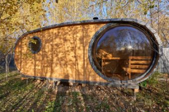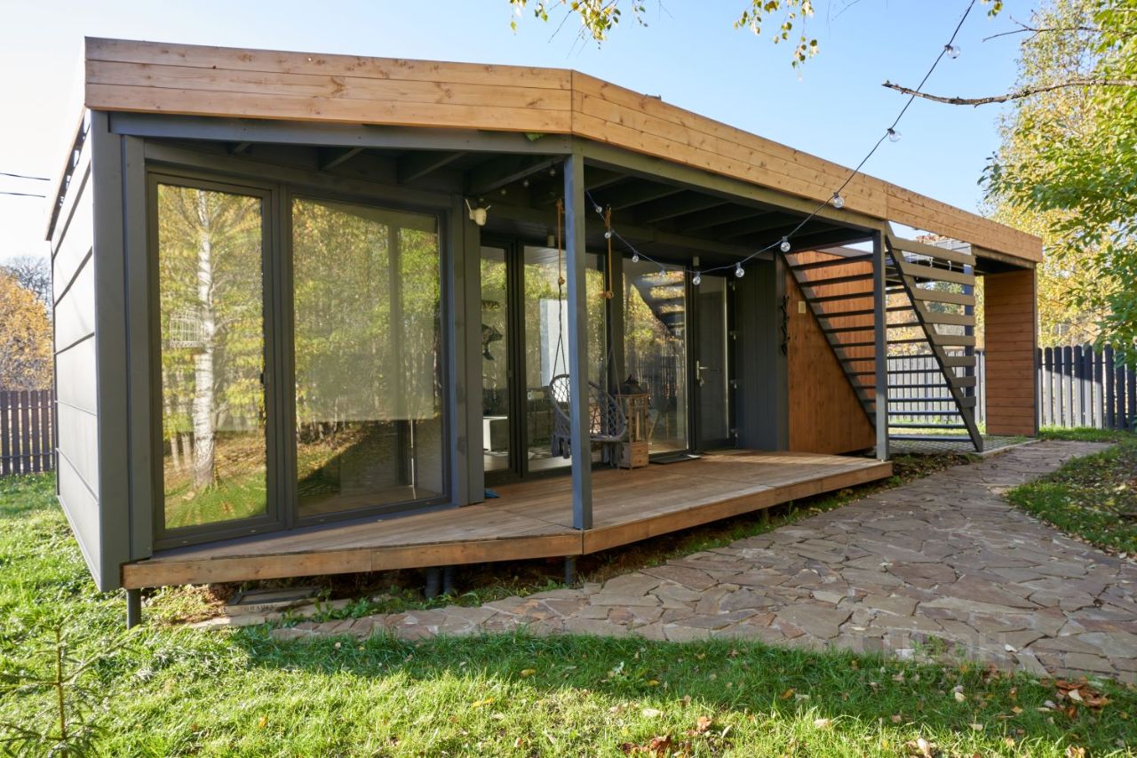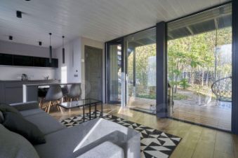 В доме 2 комнаты: большая панорамная кухня-гостиная и 1 панорамная спальня. B гостиной раскладной двуспальный диван, в доме везде теплые полы.