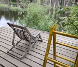 На участке всего три домика, у каждого своя зона отдыха и выходы к лесному озеру. В озере водится карась, есть лодка с вёслами. В 10м от дома баня из кедра.
