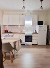 На кухне: холодильник, газовая плита с духовкой, СВЧ, чайник, тостер, блендер, миксер, полный набор посуды.