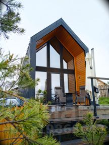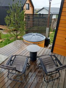 Стильный современный барн в дачном клубе "БарныЧаны". На террасе у дома горячая купель, которую можно использовать как прохладный бассейн в жару. Рядом с домом профессиональный мангал с решетками для гриля, крышкой и термос щупом для приготовления стейков.