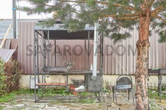 Участок в 13 соток покрыт газоном, растут плодовые деревья кустарники, есть крытое барбекю с казаном, мангалом и грилем.