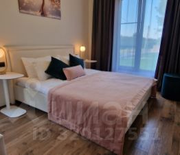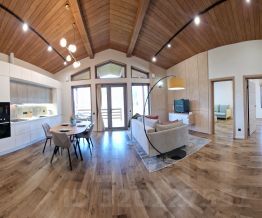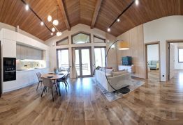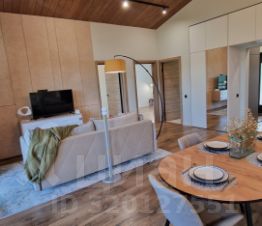 Просторная гостиная совмещена с кухней, оснащённой всем необходимым для хранения и приготовления еды, включая индукционную плиту, вытяжку, посудомоечную машину, духовой шкаф, СВЧ печь, холодильник. Обеденный стол, стулья, раскладывающийся диван и подвесная тумба с ТВ.