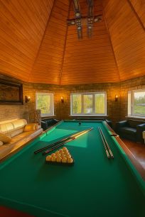 Просторный дом: Насладитесь отдыхом в просторной гостиной, двух уютных спальнях и отдельной комнате для игры в бильярд.