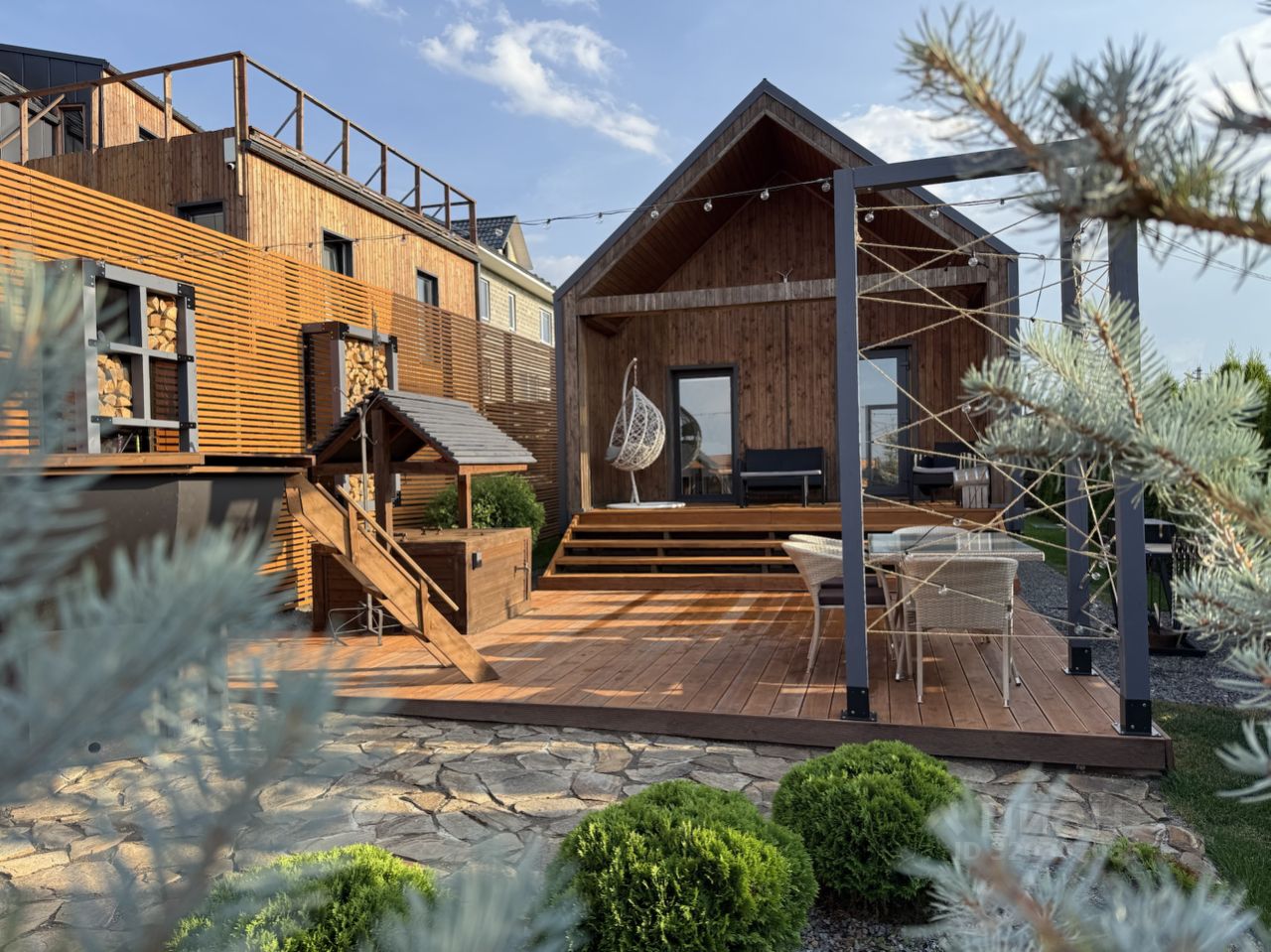 Терраса: качели-кокон, диван с креслом и кофейный столик.