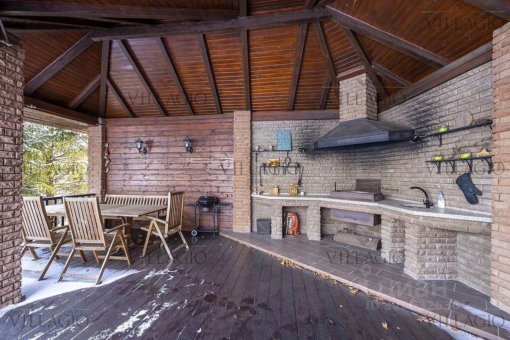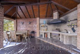 Площадь участка 23 сотки. На территории растут высокие красивые деревья, есть дорожки с уличными светильниками, оборудована зона для барбекю.