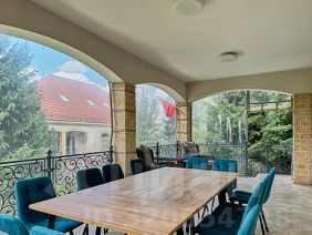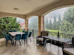 Красивая ухоженная территория 40 сот. На территории есть летняя веранда с красивой плетеной уличной мебелью, мангальная зона, парковка на 10 авто.