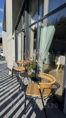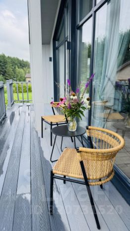 * Открытая терраса с креслами, панорамные окна с видом на лес