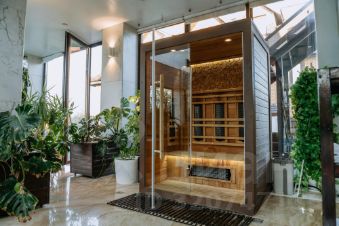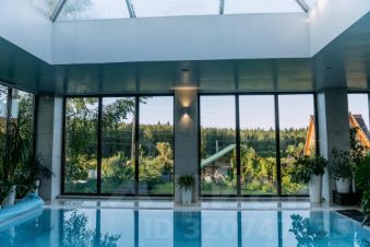 Большой бассейн с подогревом (6,5*6,5) с системой автоматической фильтрации воды и с функцией гидромассажа. Инфракрасная сауна