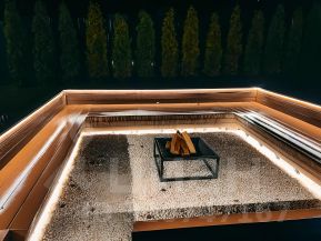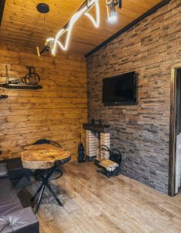 В бане: мини-холодильник, диван, стол, кресла, туалет, душевая. Банные простыни, шапочки, веники, эфирные масла и дрова входят в стоимость проживания.