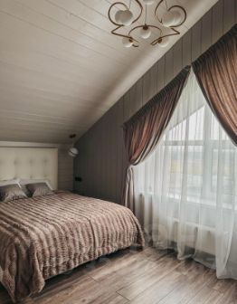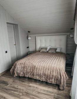 4 спальни в основном доме + раскладной диван в бане. В каждой спальне кровать размера king size, ортопедические матрасы и подушки. Постельное бельё выполнено из сатина. Смарт ТВ, прикроватные тумбочки с индивидуальным освещением, комод.