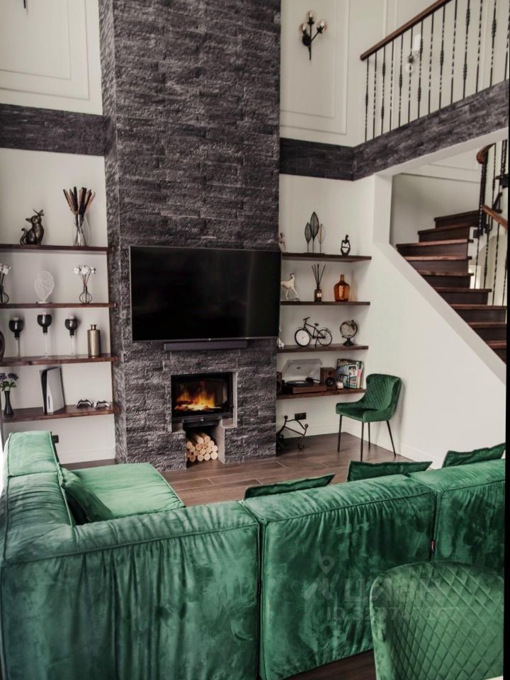 Кухня-гостинная с камином и виниловым проигрывателем. В обеденной зоне стол на 8 персон