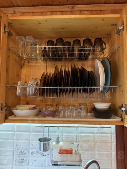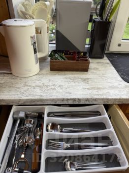 - Полностью оборудованная кухня: холодильник, микроволновка, чайник, посуда (тарелки, бокалы, столовые приборы, сковорода и др.).