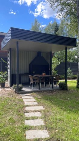 - зона барбекю на улице с мангалом и столом, уличные кресла, пледы.