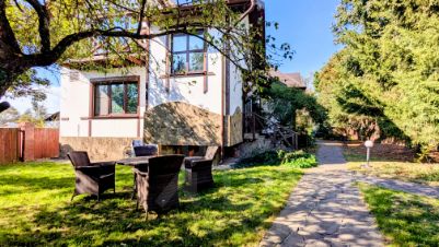 Территория: беседка с мангалом, футбольное поле, детский домик и много зелени.