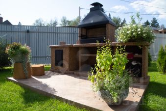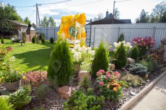 Участок застелен газоном, огорожен забором. Посажены плодовые деревья , растут ели и березы. Также есть мангал, барбекю-комплекс,.Парковка на 2 автомобиля.
