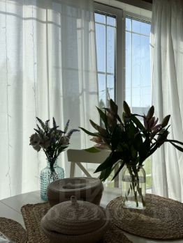 В доме всё предусмотрено для комфортного отдыха: 2 комнаты на втором этаже. Кухня и гостиная, укомплектованная бытовой техникой, плитой, духовкой и всей необходимой посудой. В ванной комнате душ, с/у, стиральная машина. К вашим услугам smаrt ТV, Wi-Fi.