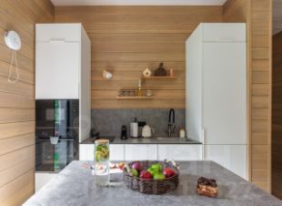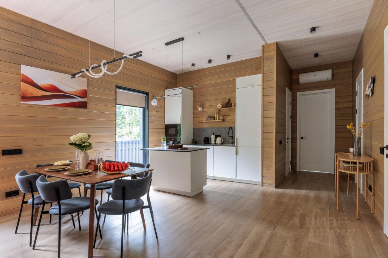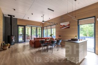 Панорамная кухня-гостиная с обеденной зоной и островом полностью оборудованная для комфортного отдыха