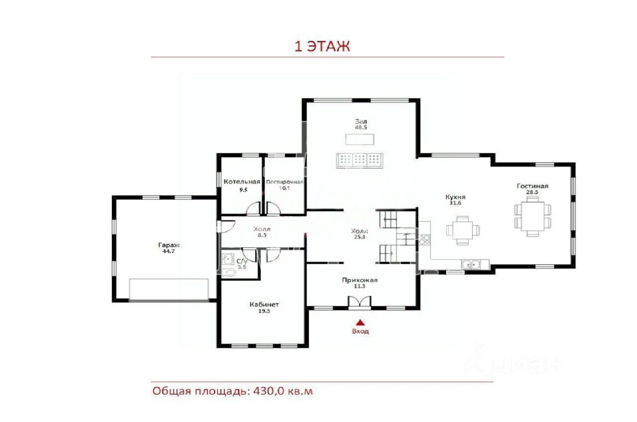 1 этаж - холл, кабинет, гостиная, кухня-столовая, гардеробная комната, с/у, постирочная.