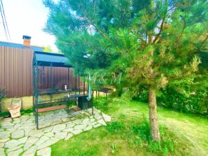 Участок в 13 соток покрыт газоном, растут плодовые деревья кустарники, есть крытое барбекю с казаном, мангалом и грилем.