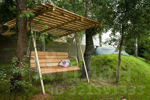 На первом этаже второго здания находятся гостиная с камином, кухня, телевизор, музыкальный центр, мягкие кресла, угловой диван, обеденный стол, санузел, ванная, на веранде барбекю. На втором этаже четыре спальни, два санузла. Комфортное размещение 14 человек, максимальное 21 человек.