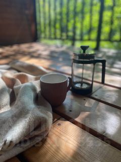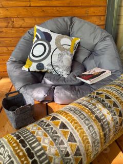 * В доме большая веранда с журнальным столиком и стульями. Место для костра с костровой чашей и двумя комфортными стульями. Пледы, подушечки .