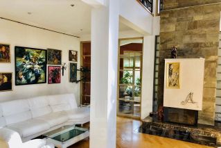 На первом этаже - финская сауна, бассейн 8*4 метра и глубина 1,6 м. с гидромассажем и подогревом, беговая дорожка и чудесная чайная комната с дровяным камином и настольный теннис.