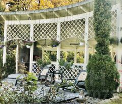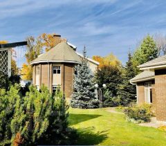 На участке газон, детская игровая зона, открытая беседка со встроенной кухней и мангалом. В ландшафтном дизайне сада много редких деревьев и растений, летом все утопает в цветах.
