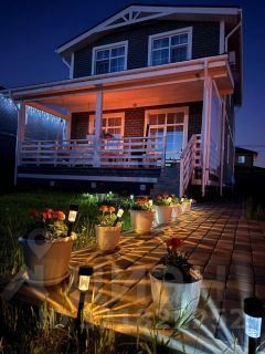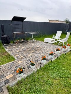 Дом площадью 122,7 м2 с террасой 21 м2 и участком 8 соток, полностью огороженный забором с воротами и парковкой на 2 автомобиля. Газон по всему участку.