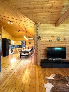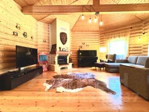 - гостиная-зал совмещенная с кухней и обеденной зоной. В зале: дровяной камин, большой угловой раскладывающийся диван (+2 дополнительных спальных места для ваших гостей!), ТV+wi-fi. Кухонный гарнитур укомплектован встроенной СВЧ, духовкой, плитой, посудомойкой, вытяжкой, раковиной со встроенным измельчителем, холодильником с морозильной камерой. На кухне расположен большой обеденный стол из натурального дерева;