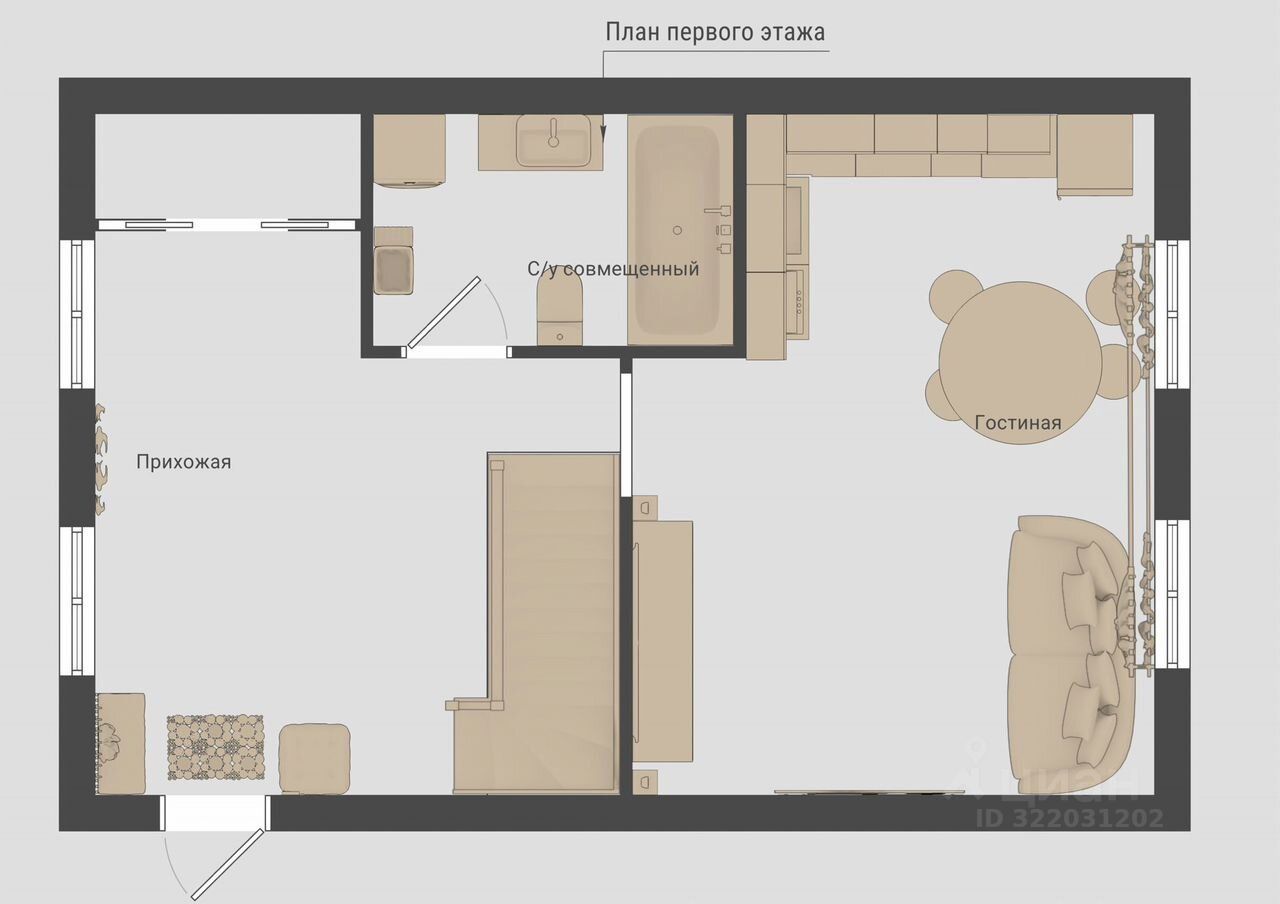 Планировка первого этажа: прихожая, гостинная с кухонной зоной, ванная комната.