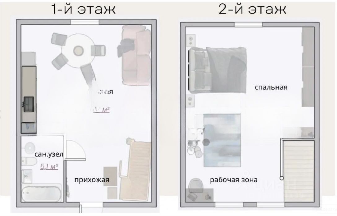 Планировка первого этажа: кухонная зона-гостиная, ванная комната.