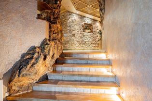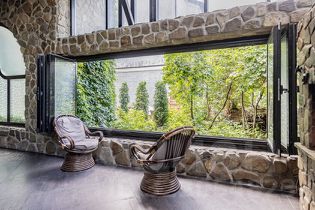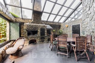 Для любителей активного отдыха предусмотрена зона барбекю с большим столом, мангалом и уютным уголком для курения. Здесь вы сможете насладиться свежеприготовленными блюдами на открытом воздухе. Внутри дома расположена гостиная с камином, идеальная для теплых встреч и уютных бесед.