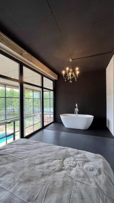 В доме 6 спален, в том числе мастер-спальня с ванной и панорамным видом на лесную чащу и бассейн