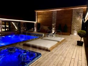 УЧАСТОК: 10 соток, ландшафтный дизайн. Имеется зона для пляжного волейбола на песке, шезлонги для принятия солнечных ванн. Масштабная веранда с барной стойкой, диванчиками и столами с видом на бассейн. Парковка
