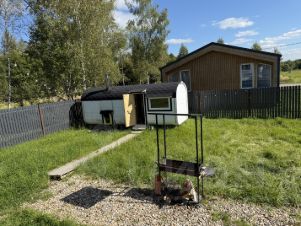 На участке — зона отдыха с мангалом и оборудованным местом отдыха для душевных вечеров у костра.