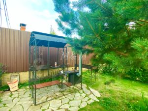 Участок в 13 соток покрыт газоном, растут плодовые деревья кустарники, есть крытое барбекю с казаном, мангалом и грилем.