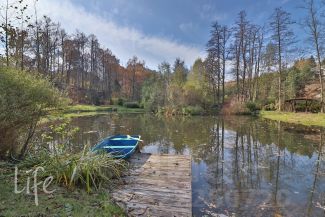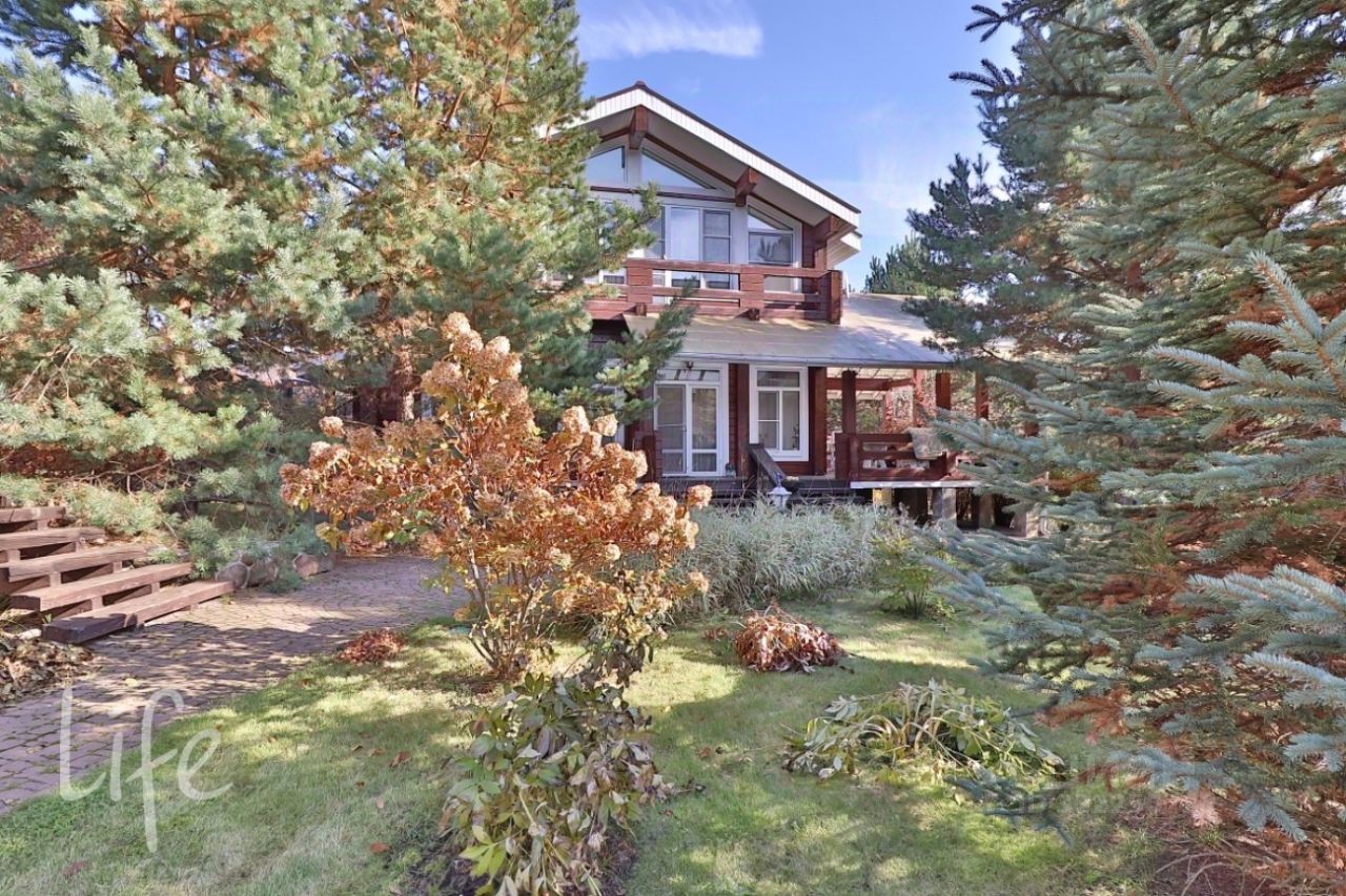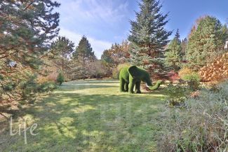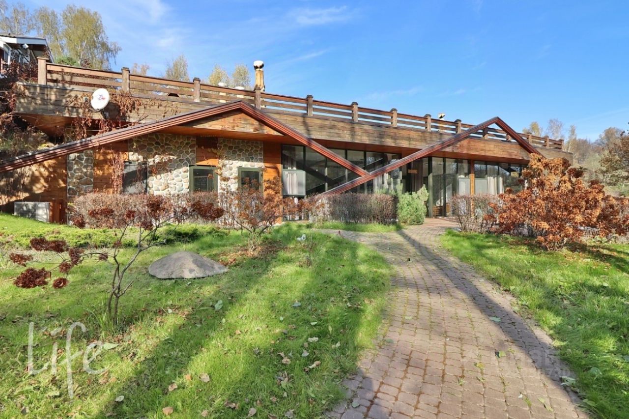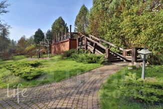 Большой участок с лесными деревьями, своим прудом с причалом для лодки, интересным природным и рукотворным ландшафтом, птичьим двором. Прогулочные дорожки выложены клинкером и петляют по всему участку, ночное освещение. На территории расположен основной дом, отдельно стоящий гараж на два автомобиля с бильярдной комнатой на втором этаже, две беседки с барбекю, помещение с зоной СПА, домик для персонала, птичий дворик, парник, лыжный подъемник.