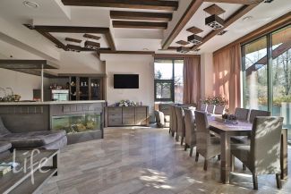 Элитный коттеджный поселок "Сосны" расположен в глубине лесного массива. Большая усадьба состоящая из основного дома, отдельно стоящего гаража с бильярдной на втором этаже, дома с зоной СПА и гостиной с камином, дома для персонала с дворовыми пристройками. Основной дом из клееного бруса, с тремя спальнями, кабинетом, гостиной. Очень светлый и уютный. Здание СПА комплекса интересно интегрировано в холм, где на крыше разбита лужайка, а внутри расположена баня, хамам, комната с джакузи, с/у, гардеробной и залом для приемов с камином, панорамные окна. На участке есть дом для персонала, птичий двор. В ландшафтный дизайн вложено очень много средств, так как местность холмистая, с лесными деревьями и протекающим ручьем. На территории расположен большой пруд с причалом для лодки, две беседки, дорожки с ночным освещением. Поселок строго охраняемый, приличные соседи, рядом расположен отель Фореста Фестиваль парк с бассейном, тренажерным залом, другими развлечениями и услугами. Очень тихо. Рекомендуем к покупке.
