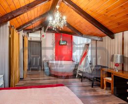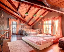 В ДОМЕ: 2 этажа, 600 кв.м., 8 спален, до 32 спальных мест. Терраса со столом и скамейками. Просторная гостиная 70 кв.м. на 45 персон с вторым светом и панорамными окнами, высота потолков 7 м. Большая кухня с необходимой посудой и техникой, обеденная зона, барная стойка. Кинозал. Сауна, большой подогреваемый бассейн. На втором этаже спальни, холл с пространством для работы.