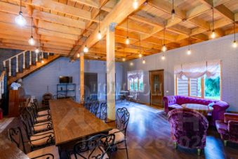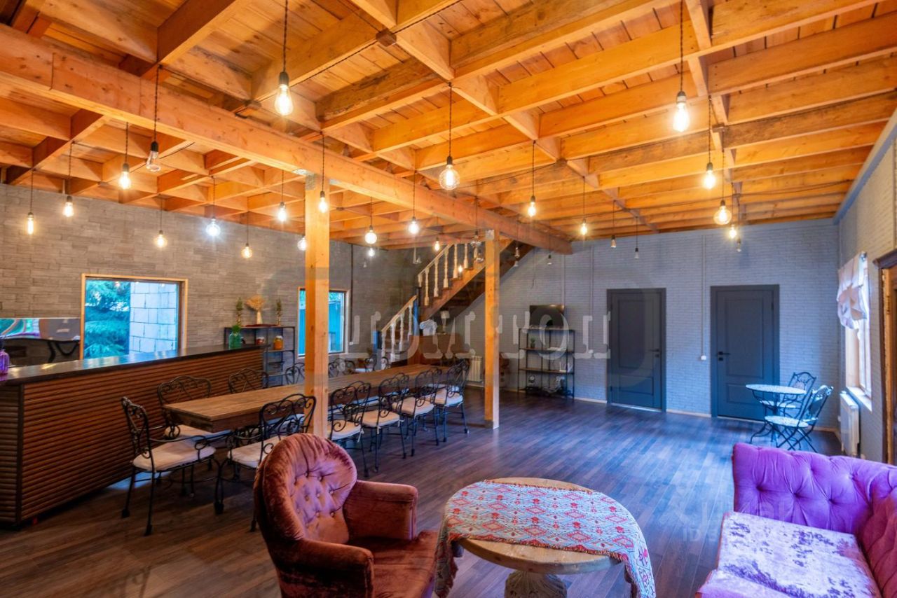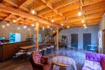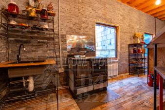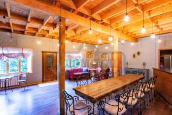 Просторная гостиная на 30 персон с обеденной зоной, барной стойкой. Печка на дровах.