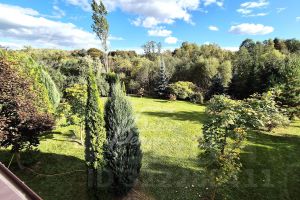 Благоустройство участка: взрослые березы, молодые ели, множество плодовых деревьев и кустарников, розарии, дорожки, газон.