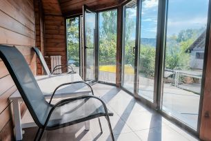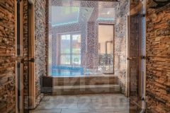 СПА-комплекс отдельно стоящий: комната отдыха с кухней; русская баня на дровах, обливное ведро, хаммам, подогреваемый бассейн 7,0*4,0*1,7. Терраса с садовой мебелью и камином. 3 спальни.