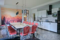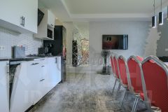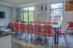 Гостиная на 25 персон: стол со стульями, диванчики, телевизор. Зона кухни с необходимой посудой и техникой.