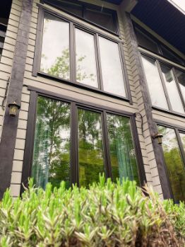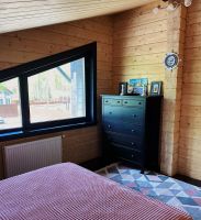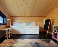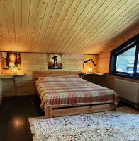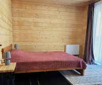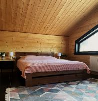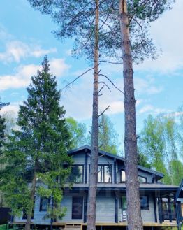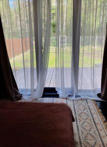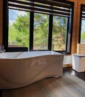 Из 2-х спален выход на балкон, из одной спальни выход на террасу. Ванная комната на втором этаже с большими панорамными окнами, огромным зеркалом и видом на ели.