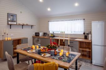 Инфраструктура поселка позволит не только насладится отдыхом в домике, но и пешими прогулками к озеру, различными спортивными активностями (мяч, волейбол, детская площадка), а после приготовить еду на гриле на веранде.