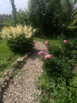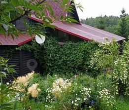 На территории растут сосны, яблони, плодовые кусты и декоративные растения.