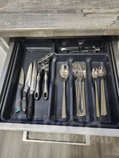 Полный набор посуды, столовых приборов и даже артезианская вода.