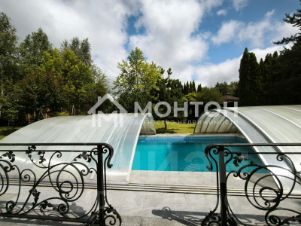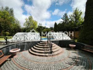 Дом полностью меблирован эксклюзивными предметами из Италии и Испании, включая люстры Swarovski и авторский декор. На участке создана курортная атмосфера: уличный бассейн с подогревом, пруд с фонтаном, две беседки (с камином-барбекю и коптильней), мраморные скульптуры и ландшафтное освещение.