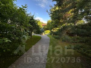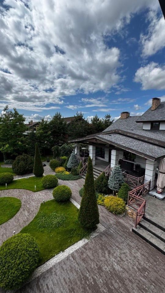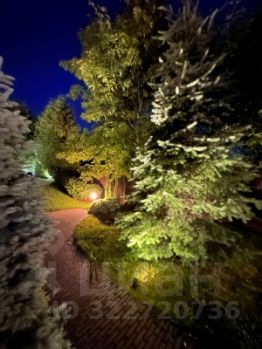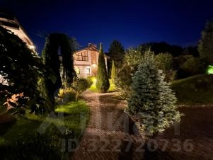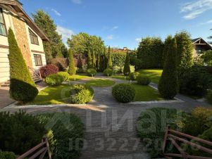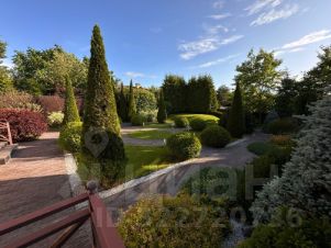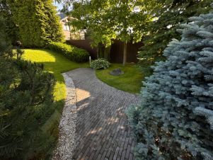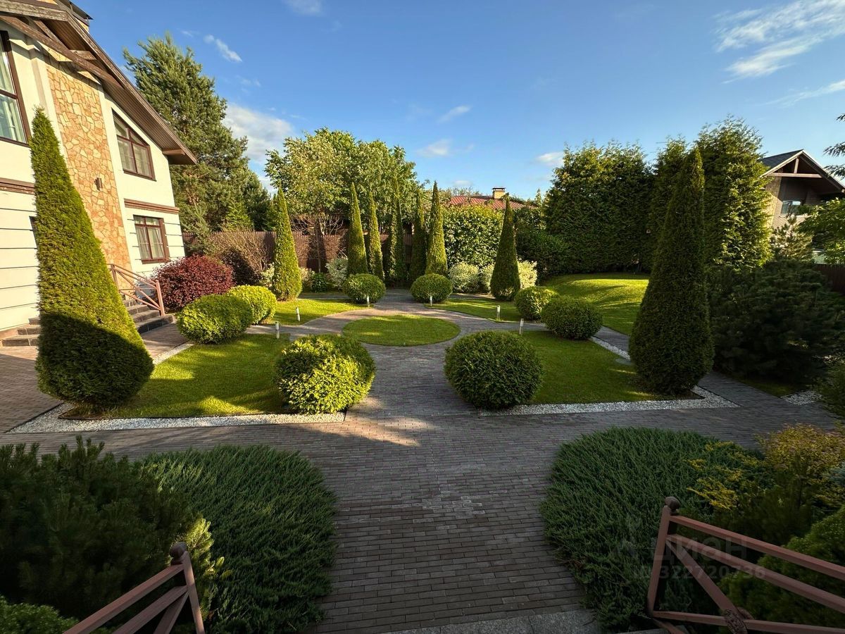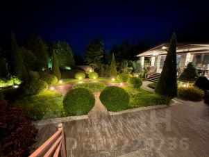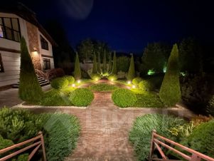 Участок вокруг дома благоустроен: ухоженная территория с зелеными насаждениями и автоматическим поливом.